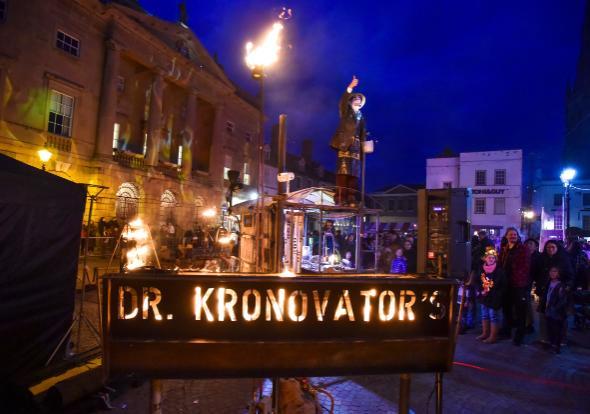 Newark Market Place was transformed into a spectacle of light and flame for the exciting Ignite: Fire, Flame and Frenzy event. We welcomed visitors to wander through a vista of flames and chemical reactions in Doctor Kronovator’s Fire Laboratory. Guests were able to help the Doctor and his team prepare their experimental flame and steam-powered contraptions, and try their luck at a test of strength machine.
